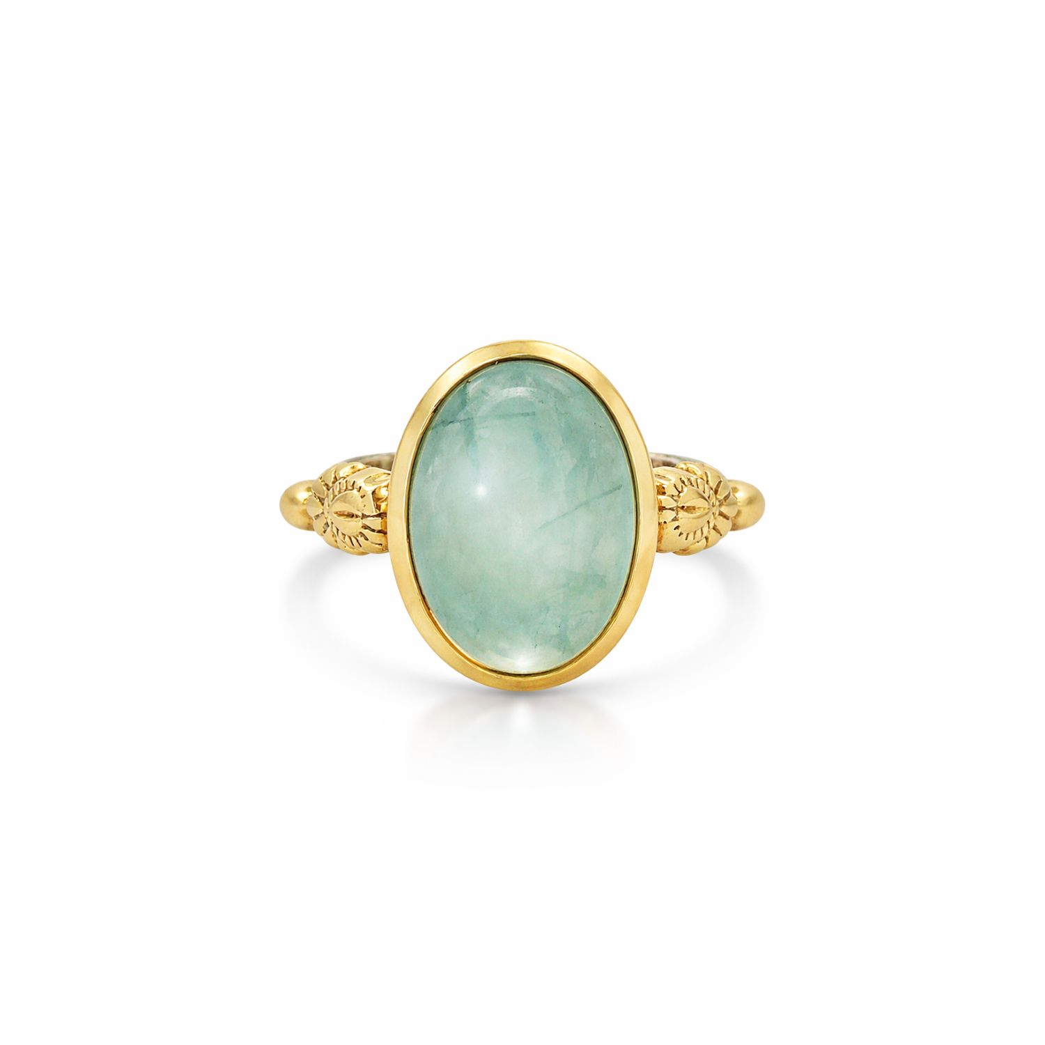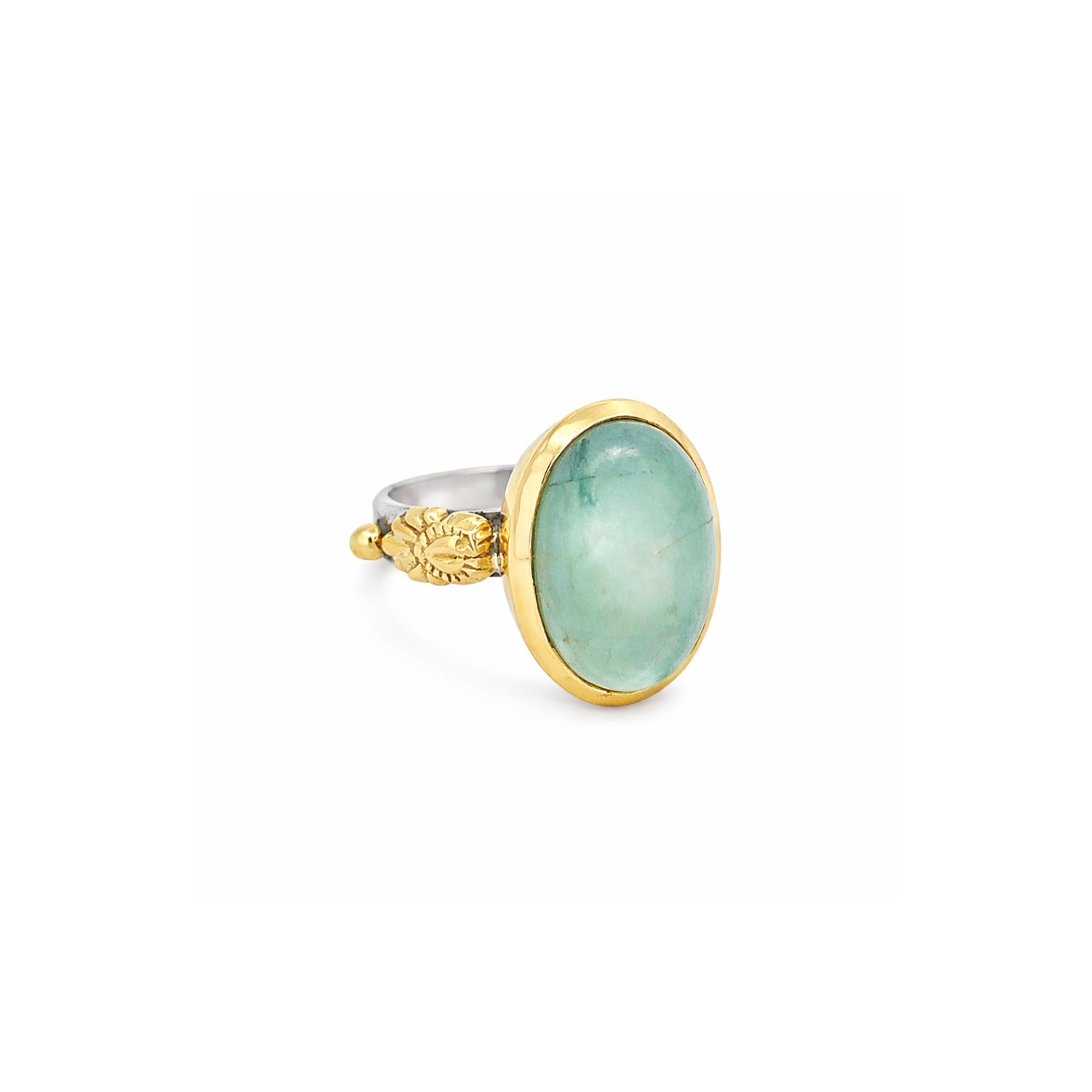 Centralnym punktem kompozycji jest zielony ametyst o szlifie kaboszonowym – kamień o hipnotyzującej, miękkiej translucencji, który zdaje się zatrzymywać światło w swoim wnętrzu. Jego miętowa tonacja kontrastuje z ciepłem złoconego metalu, tworząc harmonijną równowagę między chłodem a blaskiem. To nie tylko minerał – to serce kompozycji, wokół którego budowana jest cała narracja formy.