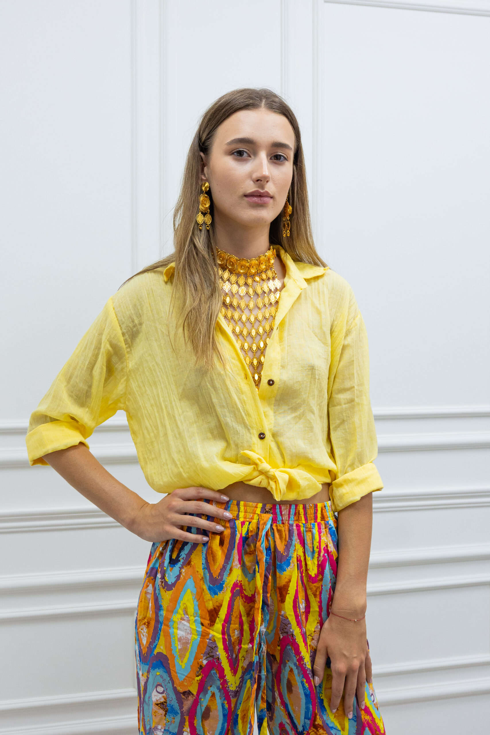 Dodaj swojej stylizacji promienny akcent! Ta bawełniana żółta koszula to połączenie komfortu, klasy i świeżego, letniego koloru. Wykonana z naturalnej bawełny, jest miękka w dotyku, przewiewna i przyjazna dla skóry, co sprawia, że doskonale sprawdzi się zarówno w ciepłe dni, jak i jako warstwa w chłodniejsze poranki.