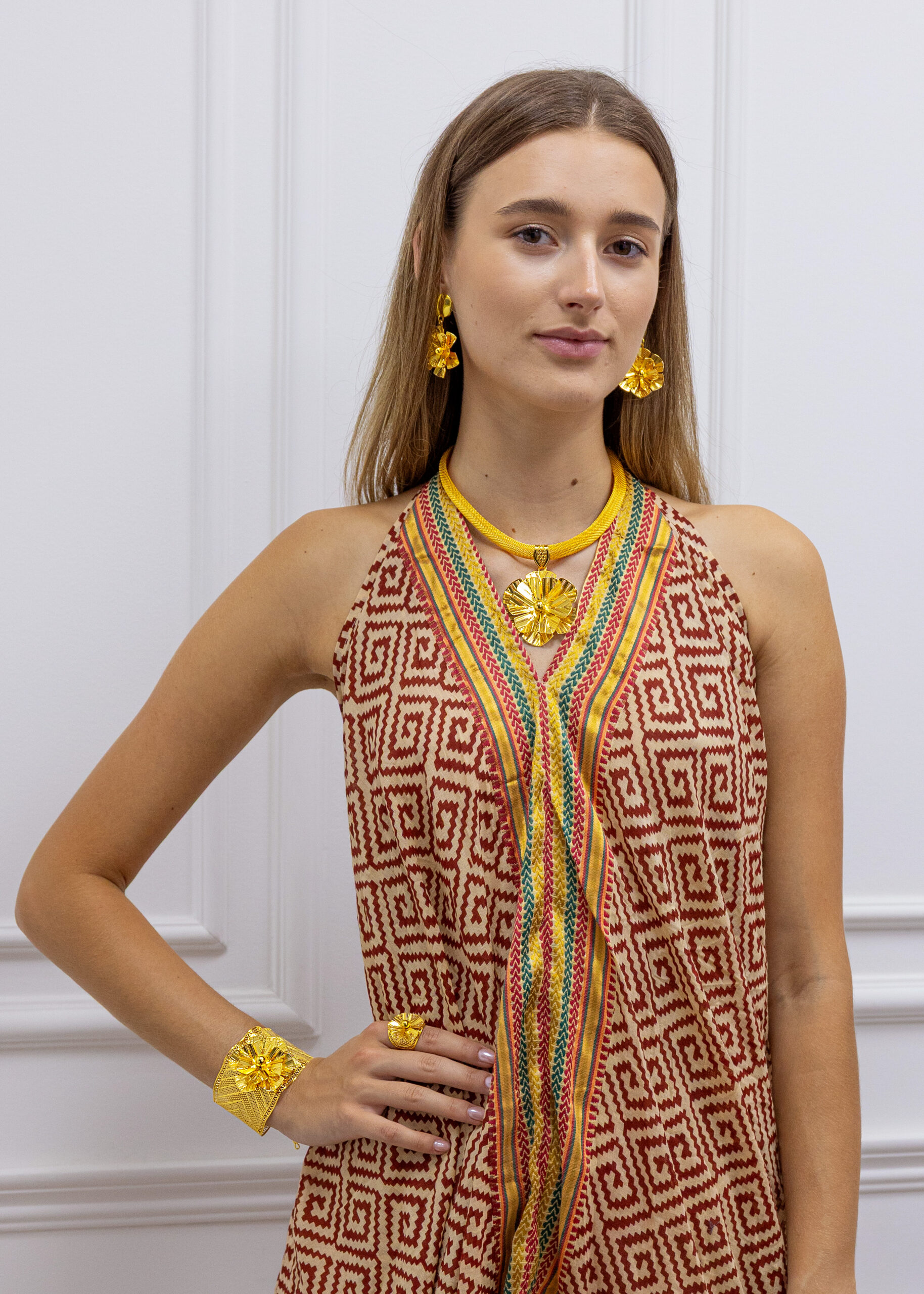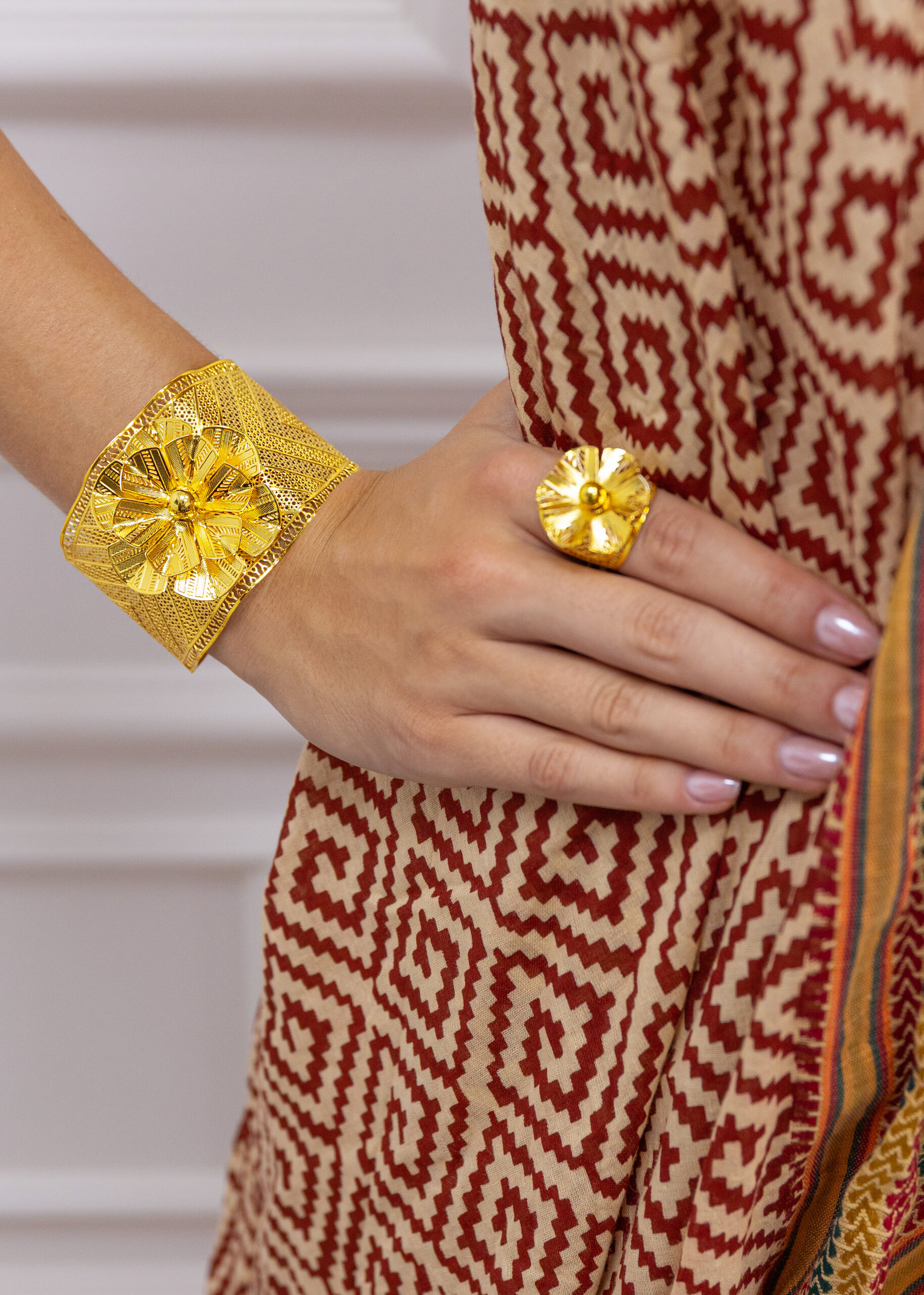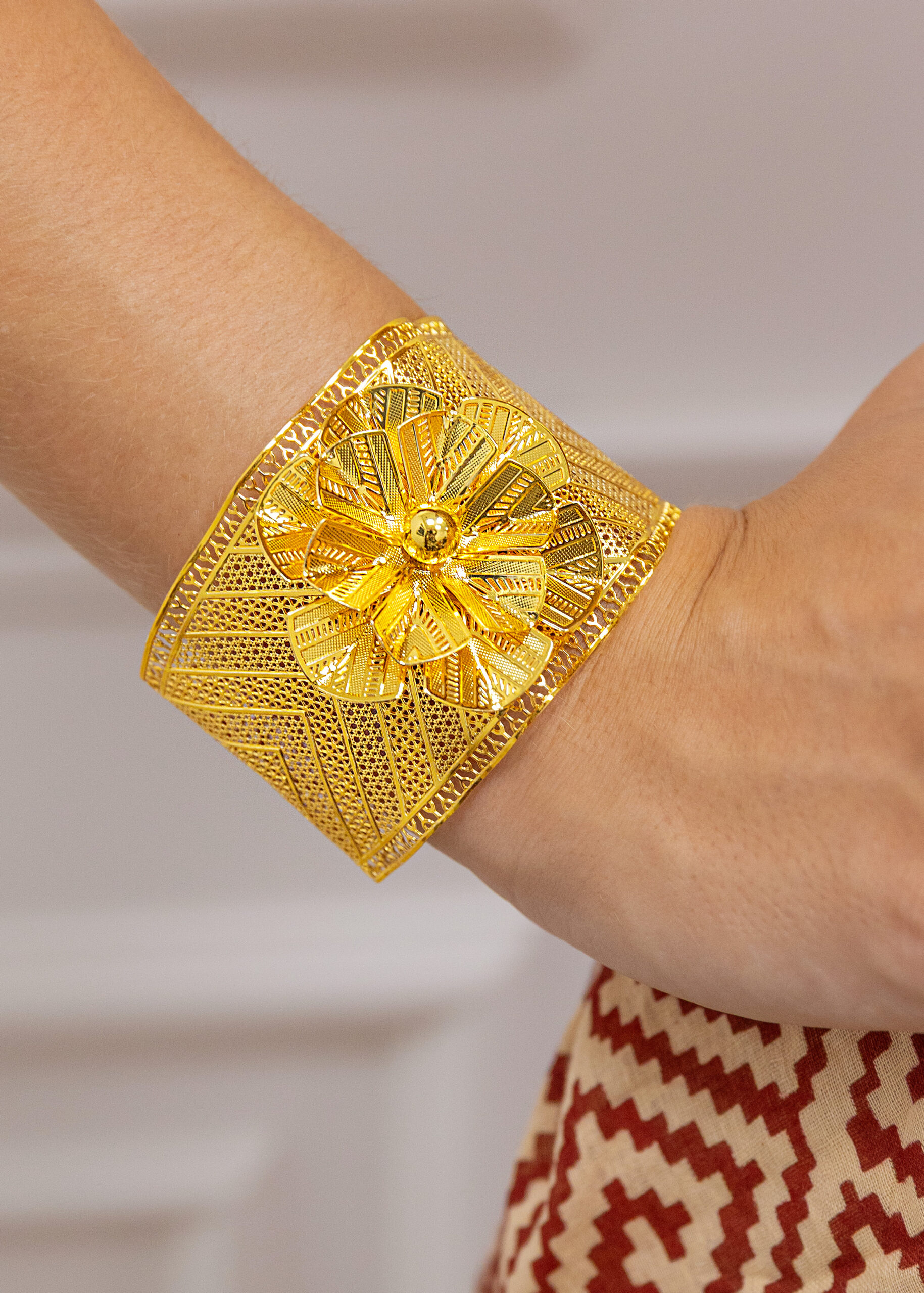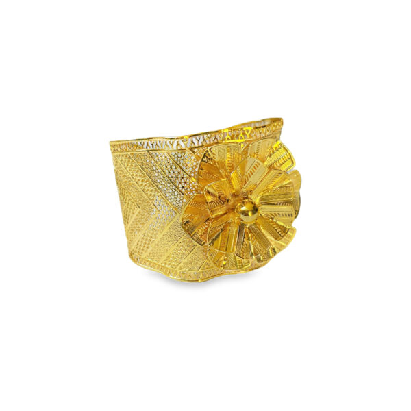 Ta wyjątkowa bransoletka bangle to połączenie klasycznej formy z artystycznym wykończeniem. Jej szeroka obręcz została ozdobiona misternymi, geometrycznymi wzorami o bogatej fakturze, które pięknie odbijają światło i nadają całości luksusowego charakteru. Największym atutem bransoletki jest dekoracyjny motyw kwiatu- pełny detali, przestrzenny i złocisty, który staje się centralnym punktem kompozycji.