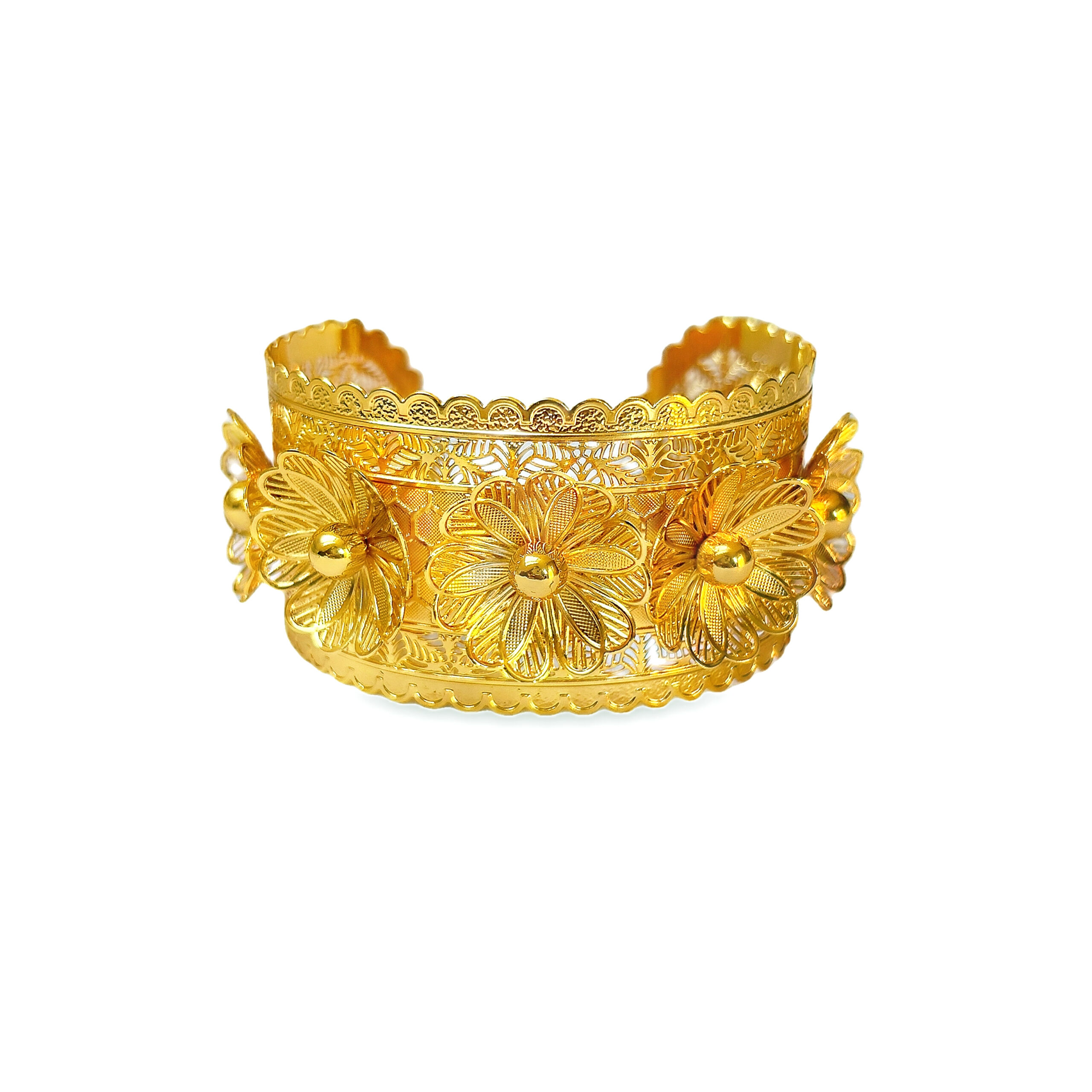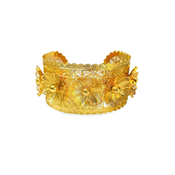 Zachwycająca, szeroka bransoletka bangle w kolorze złota to biżuteria, która przyciąga wzrok i nadaje stylizacji luksusowego charakteru. Jej niezwykłe zdobienie w formie przestrzennych kwiatów połączonych z misternym ażurowym tłem sprawia, że wygląda niczym małe dzieło sztuki jubilerskiej.