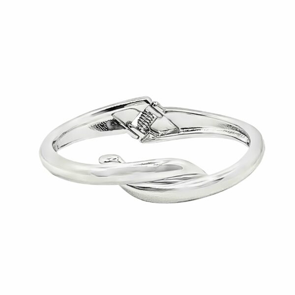 Bransoletka Bangle elegancka – stal szlachetna zachwyca nowoczesnym, asymetrycznym przeplotem ramion w chłodnym odcieniu srebra. Sztywna konstrukcja o półokrągłym profilu, lustrzany połysk i wbudowany zawias sprężynowy tworzą harmonijne połączenie designu oraz funkcjonalności. To minimalistyczna, rzeźbiarska forma dla kobiet ceniących wyrafinowaną prostotę.
