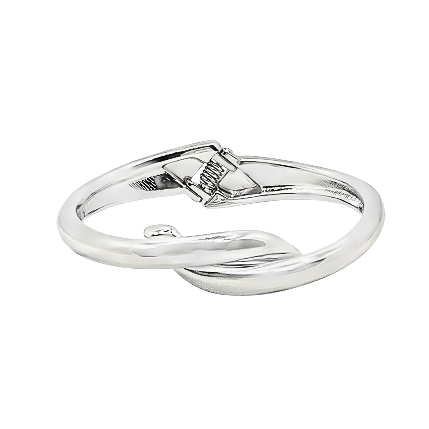 Mechanika Bransoletki Bangle elegancka – stal szlachetna została oparta na wbudowanym zawiasie sprężynowym, dyskretnie zintegrowanym z boczną częścią obwodu. Od strony wewnętrznej widoczny jest mechanizm z gęsto zwiniętą stalową sprężyną, która umożliwia płynne odchylenie jednego ramienia. Dzięki temu zakładanie biżuterii jest szybkie i wygodne, bez potrzeby stosowania tradycyjnych zapięć typu karabińczyk.