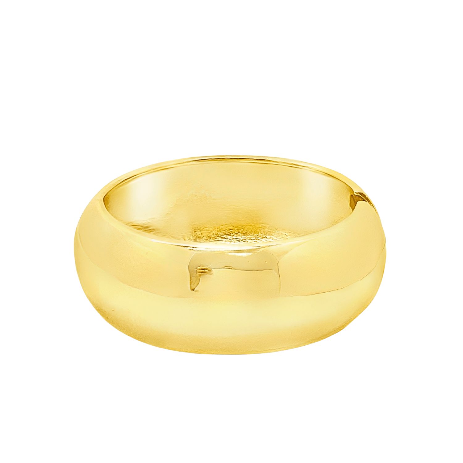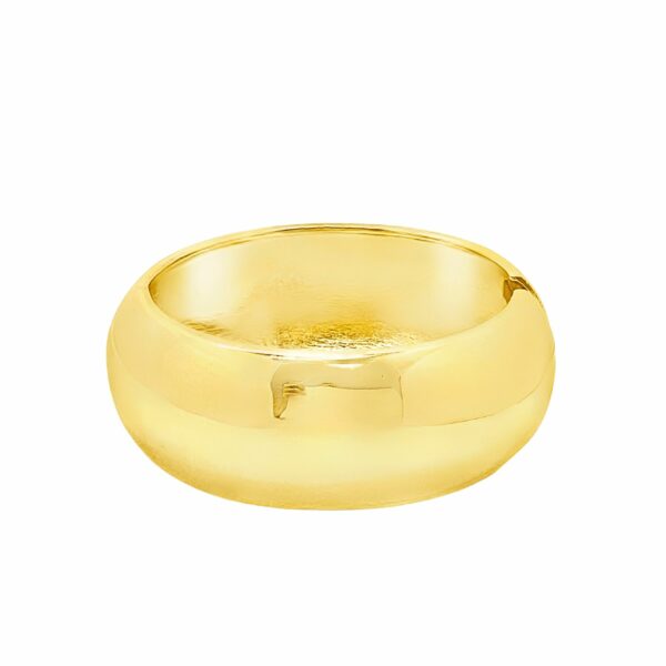 Bransoletka Bangle gładka masywna okrągła to monolityczna forma pełnego pierścienia o silnie wypukłym, lustrzanym profilu. Szeroka, symetryczna szyna tworzy efekt jednolitego kręgu, a ukryty zawias i zatrzask zapewniają wygodę użytkowania. Gładka powierzchnia w złotym odcieniu podkreśla nowoczesny, luksusowy charakter biżuterii.