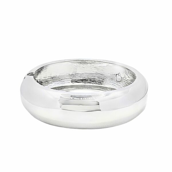 Zewnętrzna powierzchnia została wypolerowana na wysoki połysk, co nadaje bransoletce efekt lustrzanej gładkości. Stal szlachetna w srebrnym odcieniu odbija światło w sposób czysty i kierunkowy, podkreślając każdą krzywiznę oraz wypukłość bryły. Brak satynowania czy młotkowania wzmacnia wrażenie eleganckiej prostoty i wyrafinowania.