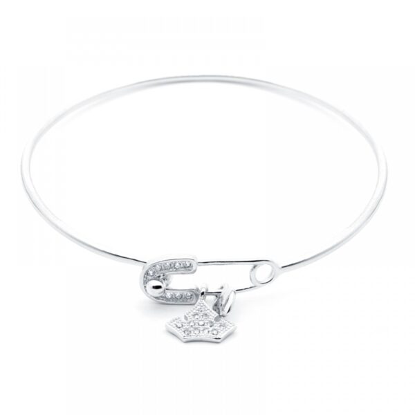 Bransoletka wykonana ze srebra uszlachetnionego rodem próby 925. Bransoletka ozdobiona zawieszkami w kształcie korony oraz serduszka. Średnica bransoletki: 6×6 cm.