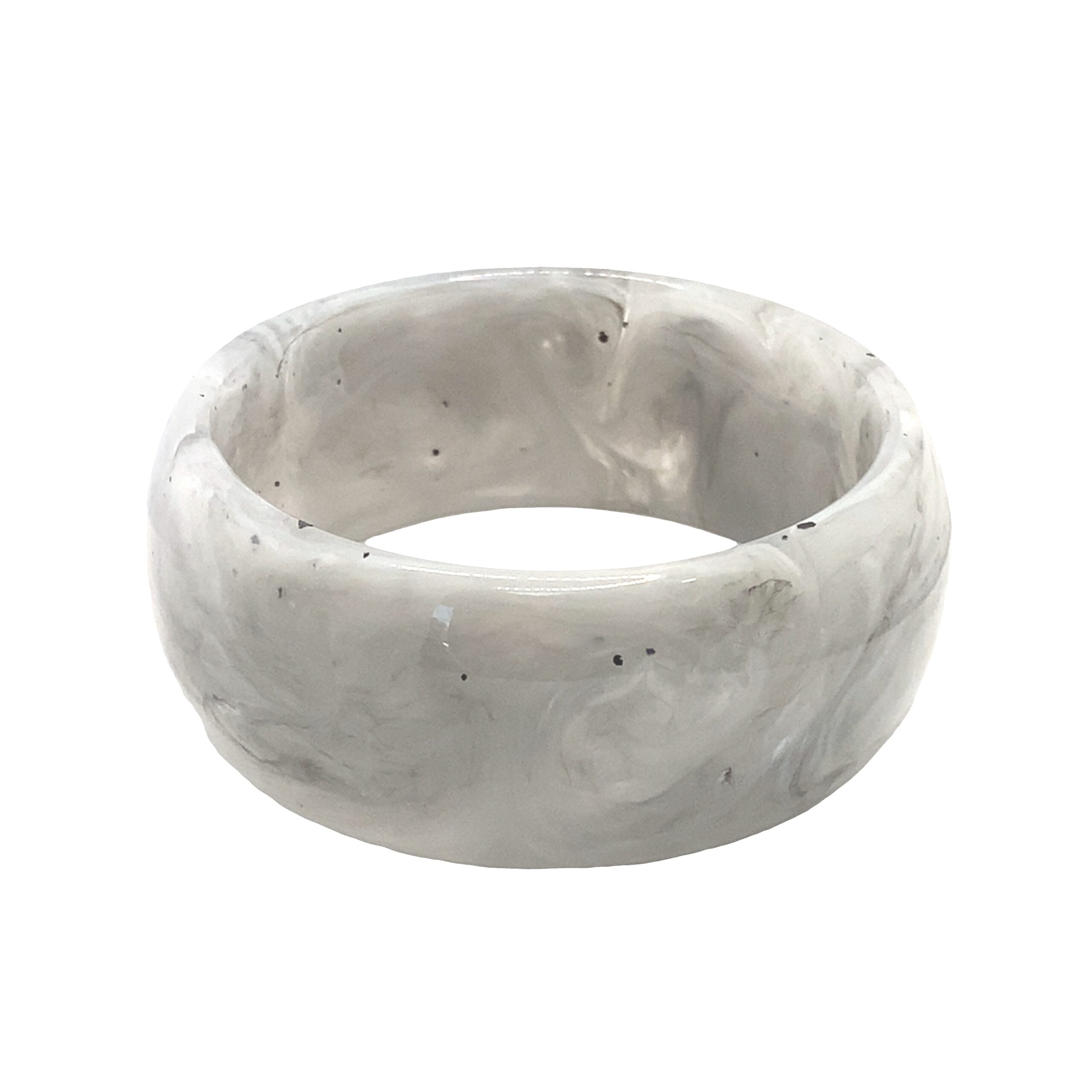 Szeroka bransoletka bangle z żywicy o marmurkowym wzorze w szarościach, bieli i czerni. Jej gładka powierzchnia z delikatnie zaokrąglonymi krawędziami tworzy masywną, lecz elegancką formę. Bransoletka minimalistyczna, bez zbędnych zdobień, idealna na codzień i wyjątkowe okazje.