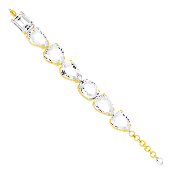 Bransoletka ozdobiona dużymi białymi topazami o rzadko spotykanych szlifach: owal, szmaragd, migdał. Szlif nadany ręcznie w najlepszej manufakturze szlifierskiej kamieni naturalnych na świecie w Jaipur w Indiach. Szlif wykonany przez profesjonalnych szlifierzy specjalizujących się w kunszcie szlifierstwa jubilerskiego. Kamień wydobyty w Birmie, regionie o unikalnych złożach białych topazów na świecie. Birmańskie białe topazy charakteryzują się najwyższą na świecie jakością, przejrzystością, unikalną barwą bieli. Są cenione przez najbardziej prestiżowe domy mody takie jak: Cartier, Tiffany, Bvlgari. Sięgają po nie uznani projektanci światowego jubilerstwa przy tworzeniu unikalnych kolekcji.