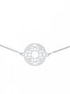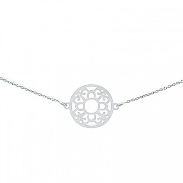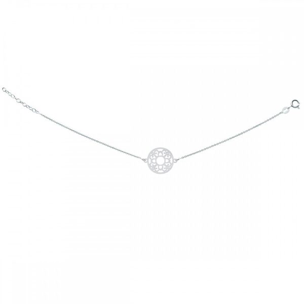 Bransoletka z zawieszką w kształcie kółeczka ażurowego, wykonana ze srebra rodowanego próby 925. Dzięki warstwie rodu biżuteria nie tylko elegancko wygląda, ale i charakteryzuje się dużą trwałością i wytrzymałością na działanie szkodliwych czynników zewnętrznych. Długość bransoletki: 16-19 cm. Wielkość zawieszki: 1,5 cm