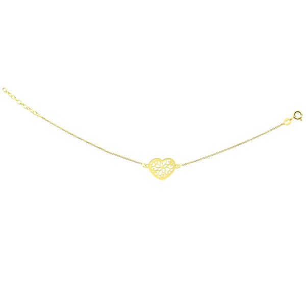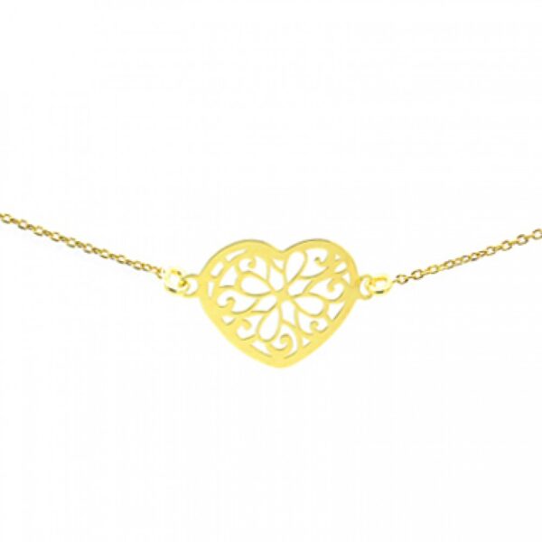 Bransoletka z zawieszką w kształcie ażurowego serduszka, wykonana ze srebra próby 925. Pozłacana 24 karatowym złotem. Ta delikatna bransoletka z kolekcji „Celebrytka” idealnie podkreśla kobiecą subtelność oraz piękno. Bransoletka ta nadaje się nie tylko do codziennych stylizacji ale również na wieczorne wyjścia. Długość bransoletki 17-20 cm. Szerokość zawieszki 1,5 cm.