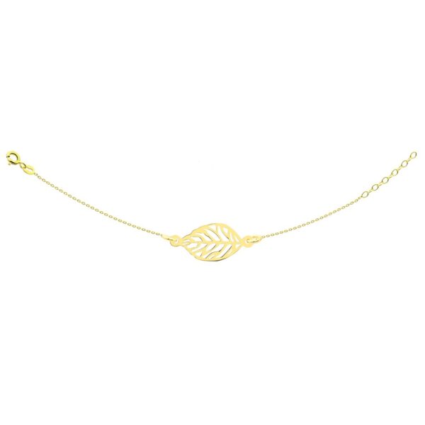 Bransoletka z zawieszką w kształcie liścia. Bransoletka wykonana ze srebra próby 925, dodatkowo pokryta warstwą 18 karatowego złota. Długość bransoletki 17-20 cm. Wielkość zawieszki: 18×8 mm.