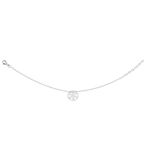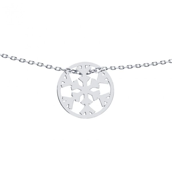 Bransoletka z zawieszką w kształcie śnieżynki. Bransoletka wykonana ze srebra uszlachetnionego rodem próby 925. Długość bransoletki regulowana: 17 lub 20 cm. Wielkość zawieszki: 12×12 mm
