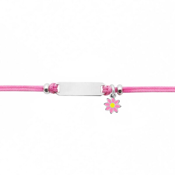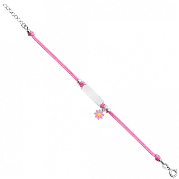 Bransoletka dla dzieci srebrna na różowym sznurku z kwiatuszkiem wykonana z najwyższej próby srebra 925 – bez dodatku niklu, nie uczula. Biżuteria modowa pokryta 3 warstwami szlachetnego rodu. Bransoletka regulowana o długości 13-16cm. Wielkość blaszki 4x18mm. Do wykonania bransoletki użyto różowego bawełnianego jubilerskiego sznurka powleczonego utwardzonym woskiem, dzięki czemu bransoletka jest trwała, sznurek nie zadziera się. Biżuteria ozdobiona zawieszką w kształcie kwiatuszka pokrytego emalią jubilerską o wielkości: 6x6mm.