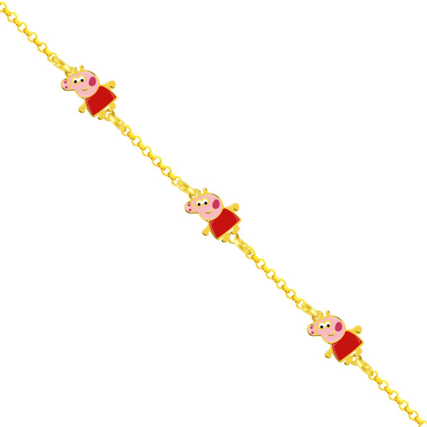 Bransoletka dziecięca srebrna pozłacana świnka peppa wykonana z najwyższej próby srebra 925 – bez dodatku niklu, nie uczula. Biżuteria dodatkowo uszlachetniona 3 warstwami 24 karatowego złota. Bransoletka z zawieszkami w kształcie świnki peppa pokrytych emalią jubilerską. Wielkość elementów ozdobnych: 8x9mm. Wykonana na łańcuszku o splocie typu rolo, który jest bardzo mocny, odporny na zerwania oraz uszkodzenia.
