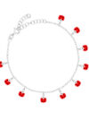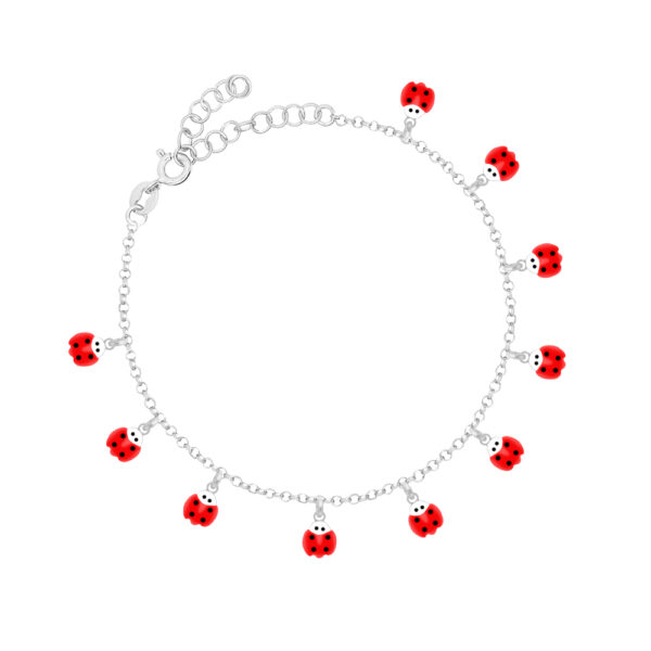 Bransoletka dziecięca srebrna z biedronkami wykonana z najwyższej próby srebra 925 – bez dodatku niklu, nie uczula. Bransoletka o regulowanej długości: 15,5-17,5 cm. Ozdobiona z zawieszkami w kształcie biedronek pokrytych emalią jubilerską. Wielkość elementów ozdobnych: 7mm. Wykonana na łańcuszku o splocie typu rolo, który jest bardzo mocny, przez co odporny na zerwania oraz uszkodzenia.