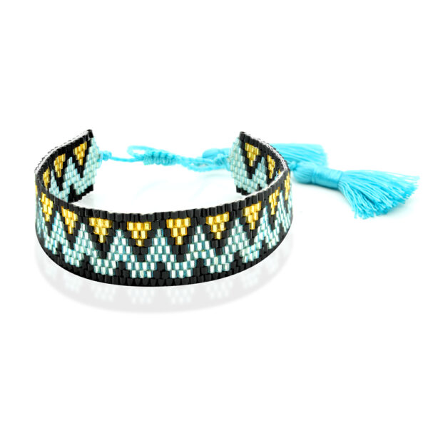 Bransoletka ściągana wykonana z rzemyka. Bransoletka zdobiona kolorowymi koralikami. Maksymalny obwód bransoletki: 22 cm.