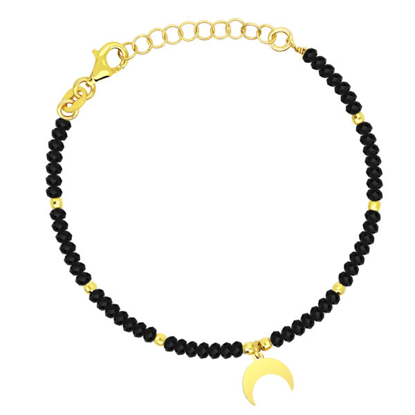 Bransoletka wykonana ze srebra próby 925. Bransoletka dodatkowo uszlachetniona 2 mikronami 24 karatowego złota. Wielkość księżyca: 10×10 mm. Bransoletka zdobiona kryształem Swarovski. Długość bransoletki: 16-19 cm. Koralikowe bransoletki to musthave tego sezonu ! To modna ozdoba damskiego nadgarstka. Świetnie prezentują się noszone samodzielnie, w zestawieniu z zegarkiem lub połączone kilka razem. Bransoletka ta idealnie uzupełni Twoją kolekcję biżuterii !
