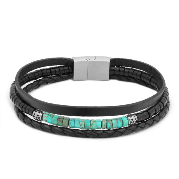 Bransoletka męska skórzana potrójna z turkusem i onyksem stal szlachetna wykonana z wysokiej jakości stali szlachetnej. Ozdobiona kamieniami naturalnymi: turkusem oraz onyksem. Stal szlachetna nie rdzewieje i jest praktyczna w codziennym użytkowaniu.