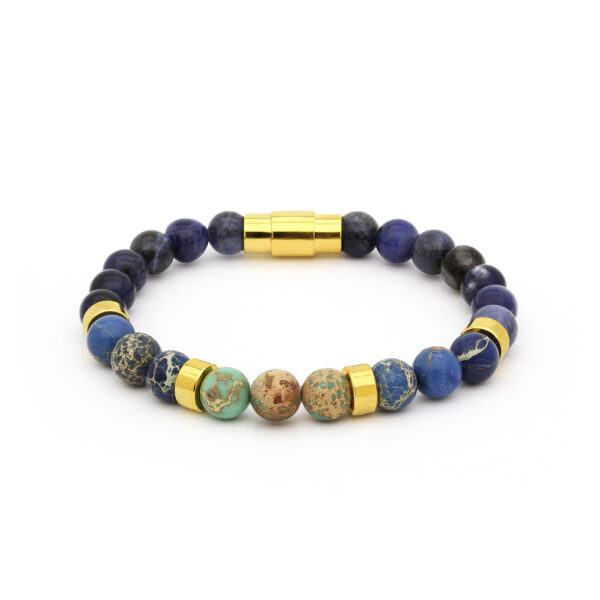 Bransoletka męska z turkusem i lapis lazuli – stal szlachetna wykonana z wysokiej jakości stali szlachetnej. Ozdobiona kamieniami naturalnymi turkusami oraz lapis lazuli. Długość bransoletki: 20cm. Stal szlachetna nie rdzewieje i jest praktyczna w codziennym użytkowaniu.