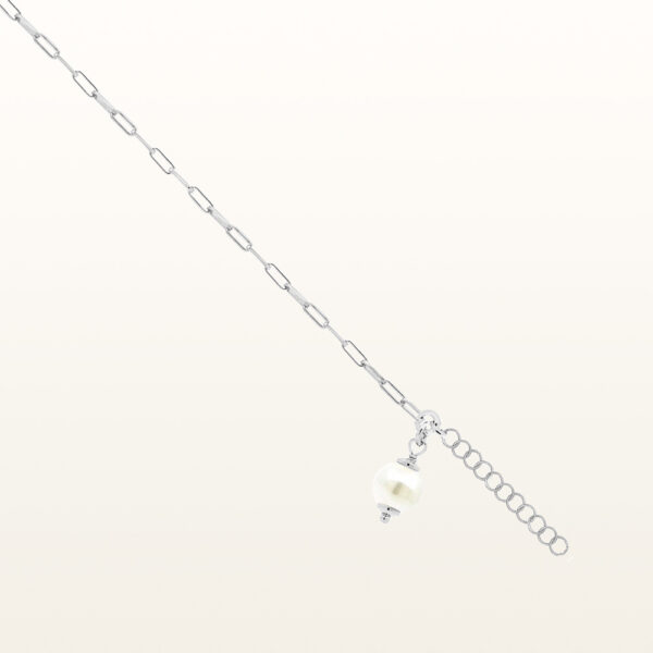 Bransoletka na nogę delikatny łańcuch z perełką srebrna wykonana z najwyższej próby srebra 925 – bez dodatku niklu, nie uczula. Biżuteria dodatkowo pokryta 3 warstwami szlachetnego rodu. Długość bransoletki: 22-25 cm. Precioza ozdobiona naturalną perłą hodowlaną słodkowodną. Wyrób jubilerski wysokiej jakości wykonany przez mistrzów jubilerstwa z ogromną precyzją oraz dbałością o detale.
