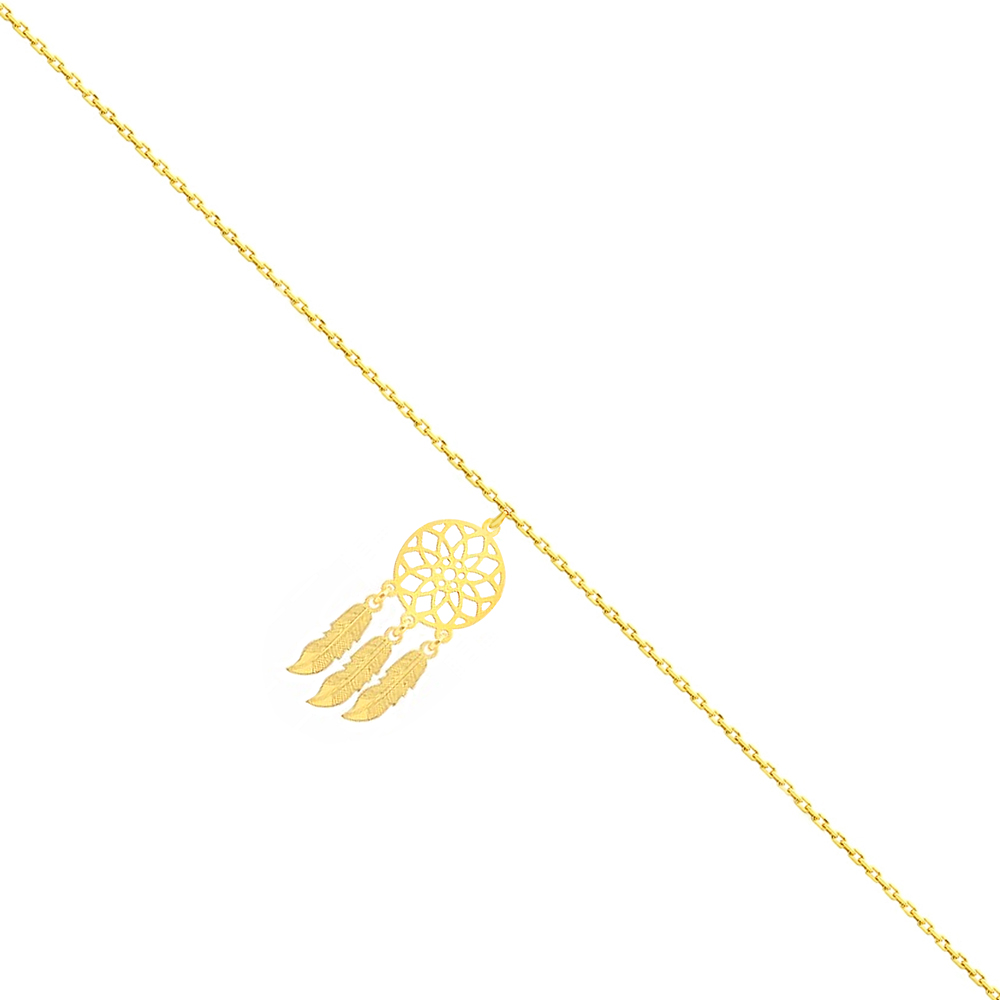 Bransoletka na nogę łapacz snów srebrna pozłacana to subtelna biżuteria wykonana ze srebra próby 925 pokrytego 24-karatowym złotem. Delikatny łańcuszek ankier ozdobiony jest ażurową rozetą inspirowaną motywem łapacza snów oraz trzema ruchomymi zawieszkami w formie piór. Precyzyjna konstrukcja i regulowana długość sprawiają, że bransoletka elegancko podkreśla linię kostki.