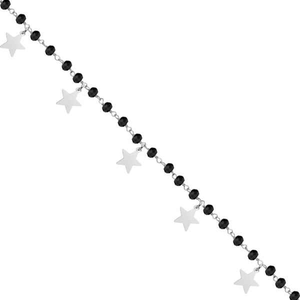 Bransoletka na nogę srebrna gwiazdki i czarne kryształki, wykonana z najwyższej próby srebra 925 – bez dodatku niklu, nie uczula. Biżuteria dodatkowo pokryta 3 warstwami szlachetnego rodu. Bransoletka ozdobiona zawieszkami gwiazdkami i czarnymi koralikami Swarovskiego. Długość bransoletki: 21-26 cm.
