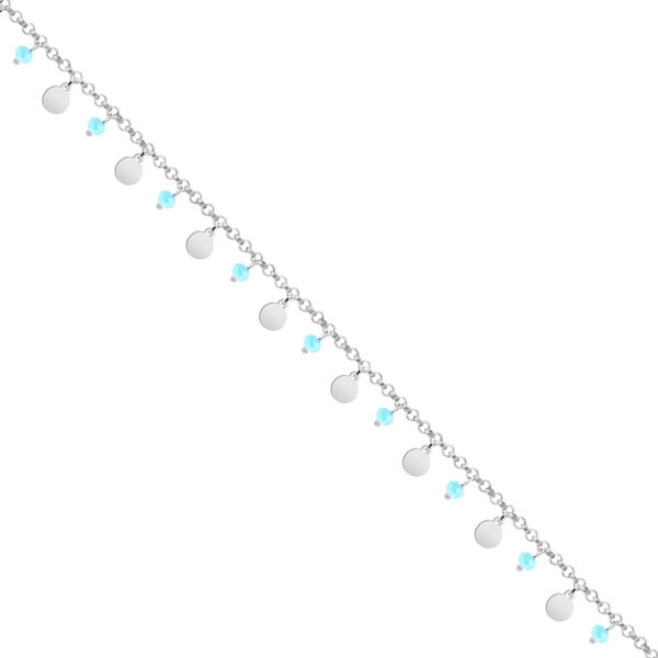 Bransoletka na nogę srebrna kółeczka z kryształkami swarovskiego. Biżuteria modowa wykonana z najwyższej próby srebra 925. Bransoletka dodatkowo uszlachetniona 3 warstwami szlachetnego rodu. Długość bransoletki: 22-25 cm. Bransoletka na nogę ozdobiona zawieszkami kółeczkami oraz niebieskimi kryształkami swarovskiego. Wyrób jubilerski o bardzo unikatowym wzorze wykonany z ogromną precyzją oraz mistrzowskim kunsztem w każdym detalu.