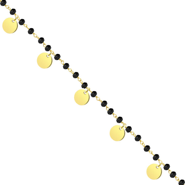 Bransoletka na nogę srebrna pozłacana kółeczka i czarne kryształki,wykonana z najwyższej próby srebra 925 – bez dodatku niklu, nie uczula. Biżuteria dodatkowo pokryta 3 warstwami 24 karatowego złota. Bransoletka ozdobiona zawieszką blaszką i czarnymi koralikami Swarovskiego. Długość bransoletki: 21-26 cm.