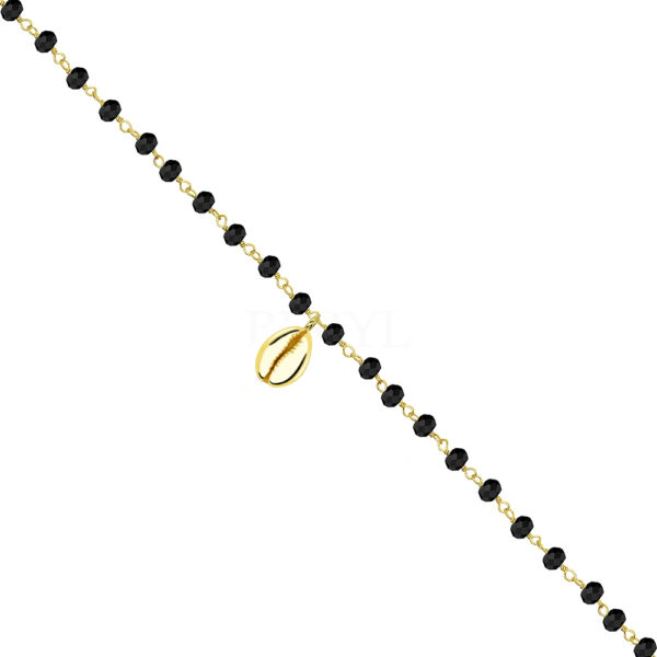 Bransoletka na nogę srebrna pozłacana muszelka czarne koraliki, wykonana z najwyższej próby srebra 925 – bez dodatku niklu, nie uczula. Biżuteria dodatkowo pokryta 3 warstwami 24 karatowego złota. Bransoletka ozdobiona czarnymi kryształkami Swarovski oraz zawieszką muszelką. Długość bransoletki: 21-25,5 cm.