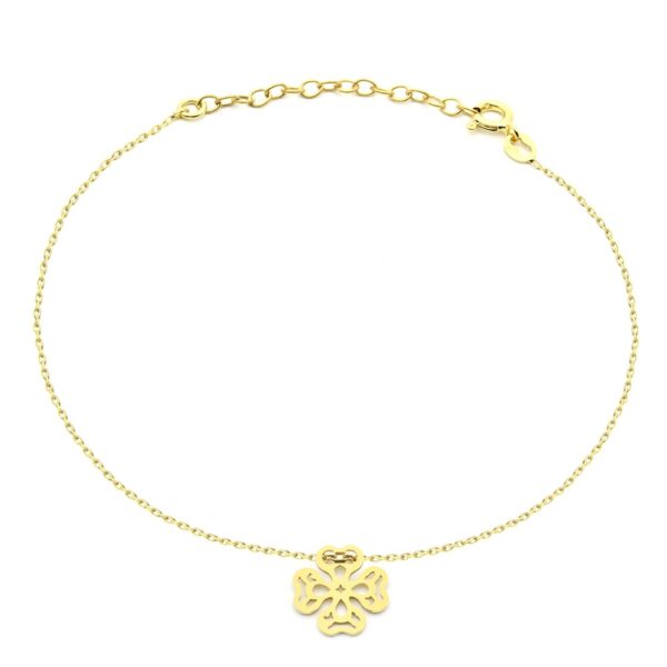 Bransoletka na nogę z kolekcji „Celebrytka”, ozdobiona zawieszka w kształcie ażurowej koniczynki. Bransoletka wykonana ze srebra próby 925, dodatkowo pokryta warstwą 18 karatowego złota. Długość bransoletki 21-25 cm. Wielkość zawieszki 10×10 mm.