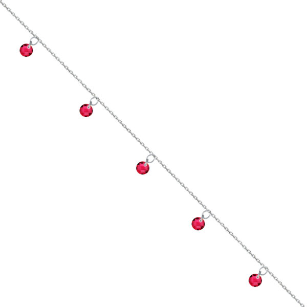 Bransoletka na nogę srebrna z czerwonymi kryształkami, wykonana z najwyższej próby srebra 925 – bez dodatku niklu, nie uczula. Biżuteria dodatkowo pokryta 3 warstwami szlachetnego rodu. Długość bransoletki: 22-27 cm. Precioza ozdobiona czerwonymi kryształkami swarovskiego. Wyrób jubilerski wysokiej jakości wykonany przez mistrzów jubilerstwa z ogromną precyzją oraz dbałością o detale.