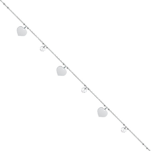 Bransoletka na nogę srebrna z serduszkami i białymi kryształkami
