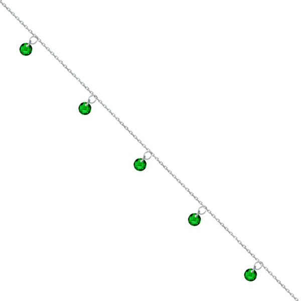Bransoletka na nogę srebrna z zielonymi kryształkami, wykonana z najwyższej próby srebra 925 – bez dodatku niklu, nie uczula. Biżuteria dodatkowo pokryta 3 warstwami szlachetnego rodu. Długość bransoletki: 22-27 cm. Precioza ozdobiona zielonymi kryształkami swarovskiego. Wyrób jubilerski wysokiej jakości wykonany przez mistrzów jubilerstwa z ogromną precyzją oraz dbałością o detale.