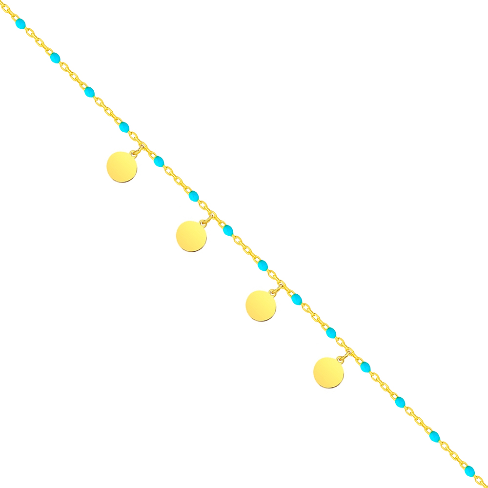 Bransoletka na nogę z blaszkami oraz niebieskimi koralikami srebrna pozłacana wykonana z najwyższej próby srebra 925 – bez dodatku niklu, nie uczula.