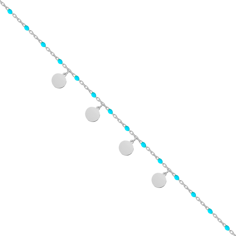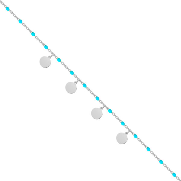 Bransoletka na nogę z blaszkami oraz niebieskimi koralikami srebrna wykonana z najwyższej próby srebra 925 – bez dodatku niklu, nie uczula. Biżuteria dodatkowo pokryta 3 warstwami szlachetnego rodu. Długość bransoletki: 22-25 cm. Precioza ozdobiona kuleczkami z niebieskiej emalii jubilerskiej oraz zawieszkami blaszkami o gładkiej błyszczącej powierzchni, które przepięknie odbiją światło.