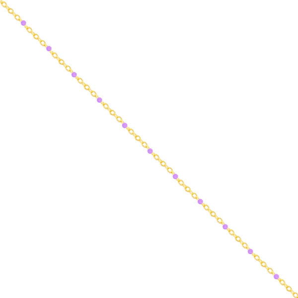 Najbardziej charakterystycznym elementem dekoracyjnym tej biżuterii są drobne, starannie rozmieszczone kuliste elementy w intensywnym odcieniu fioletu. Kuleczki zostały rozmieszczone w regularnych odstępach wzdłuż całej długości łańcuszka, co nadaje projektowi uporządkowaną rytmikę wizualną. Ich symetryczne ułożenie sprawia, że bransoletka na nogę z fioletowymi kuleczkami srebrna pozłacana zachowuje harmonijną proporcję między minimalistyczną konstrukcją a wyrazistym detalem kolorystycznym.