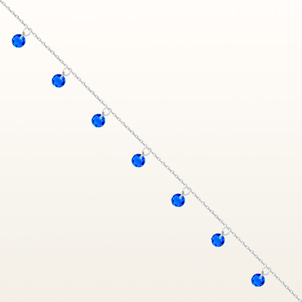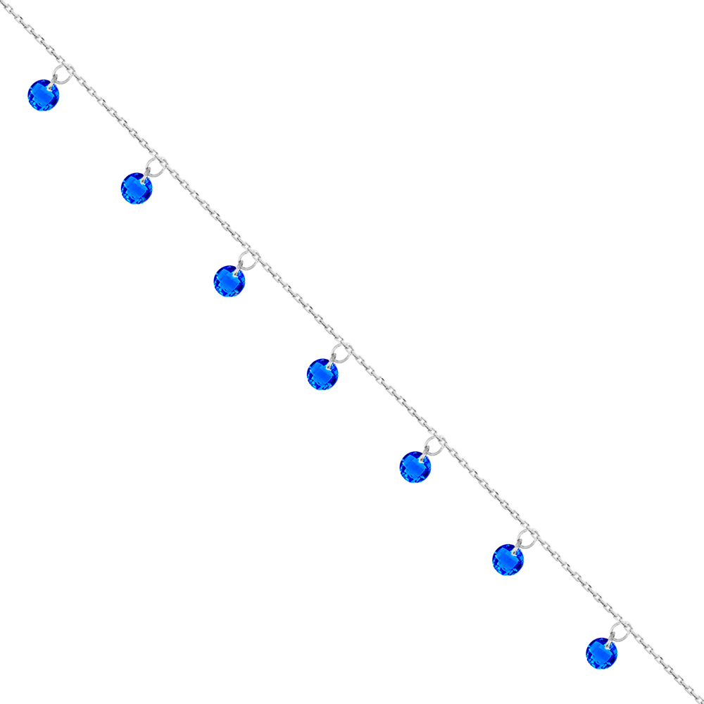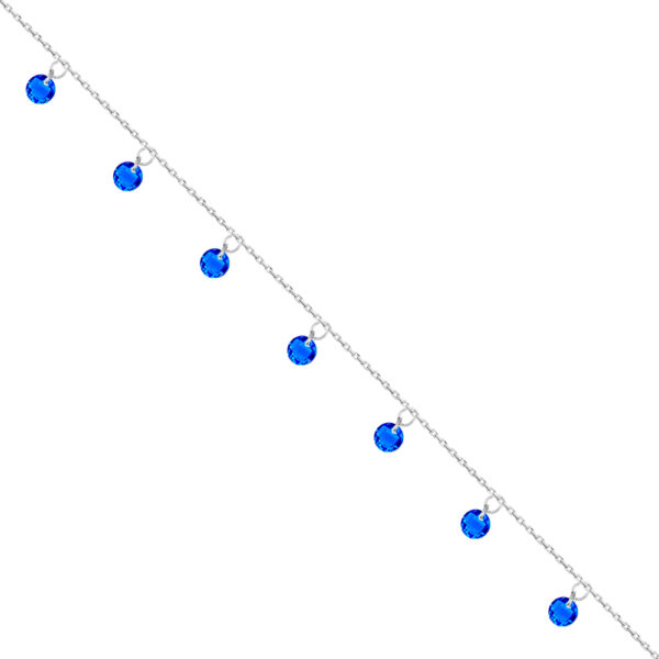 Bransoletka na nogę z granatowymi kryształkami srebrna wykonana z najwyższej próby srebra 925 – bez dodatku niklu, nie uczula. Biżuteria dodatkowo pokryta 3 warstwami szlachetnego rodu. Długość bransoletki: 23,5-27 cm. Precioza ozdobiona granatowymi kryształkami swarovskiego. Wyrób jubilerskiwysokiej jakości wykonany przez mistrzów jubilerstwa z ogromną precyzją oraz dbałością o detal
