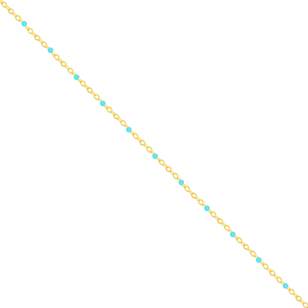 Najbardziej charakterystycznym elementem dekoracyjnym tej kompozycji są sferyczne komponenty o intensywnie niebieskiej barwie. Kuleczki rozmieszczone zostały w precyzyjnych odstępach – dokładnie co trzy ogniwa łańcuszka – tworząc regularny, rytmiczny układ na całej długości bransoletki. Ich kolor przypomina nasycony odcień turkusu, co w połączeniu ze złoconym metalem buduje efekt eleganckiego kontrastu.