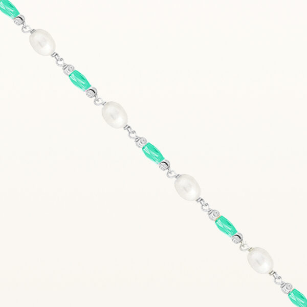 Bransoletka na nogę z perłami oraz zielonymi kryształkami srebrna wykonana z najwyższej próby srebra 925 – bez dodatku niklu, nie uczula. Biżuteria dodatkowo pokryta 3 warstwami szlachetnego rodu. Długość bransoletki: 22-25,5 cm. Precioza ozdobiona naturalną perłą hodowlaną słodkowodną oraz zielonymi kryształkami swarovskiego. Wyrób jubilerski wysokiej jakości wykonany przez mistrzów jubilerstwa z ogromną precyzją oraz dbałością o detale.