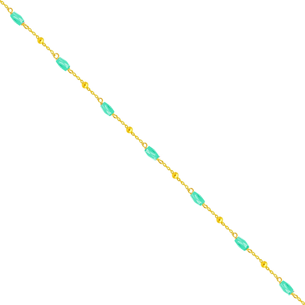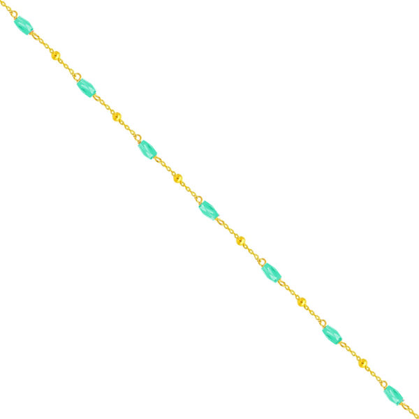 Bransoletka na nogę z zielonymi kryształkami srebrna pozłacana to lekka i subtelna biżuteria. Cylindryczne zielone kryształy i pozłacane kuleczki tworzą harmonijny rytm, podkreślając linię kostki eleganckim blaskiem.