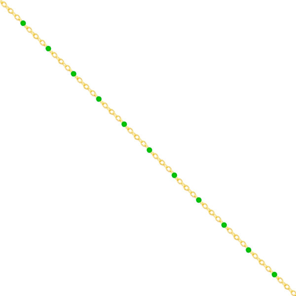 Charakterystycznym elementem dekoracyjnym tej kompozycji są niewielkie, sferyczne kuleczki o intensywnej zielonej barwie. Rozmieszczono je w rygorystycznie zachowanych odstępach – dokładnie co trzy ogniwa łańcuszka. Taki układ tworzy rytmiczną sekwencję punktów kolorystycznych, które nadają całej bransoletce wyraźny, geometryczny porządek wizualny.