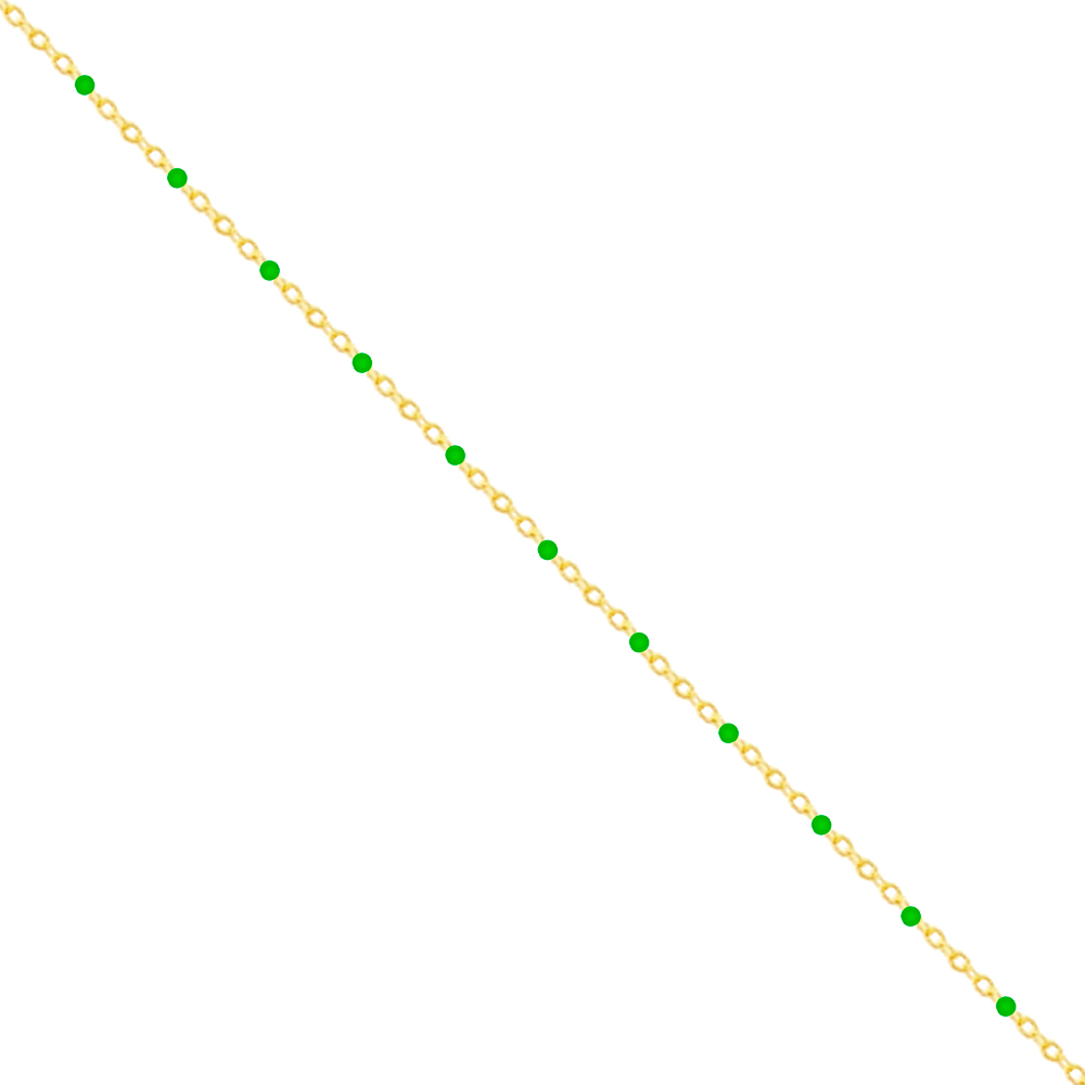 Bransoletka na nogę z zielonymi kuleczkami srebrna pozłacana to subtelna biżuteria o minimalistycznej konstrukcji ankierowego łańcuszka. Regularne ogniwa pokryte warstwą 24-karatowego złota uzupełniają emaliowane sfery w intensywnym zielonym odcieniu. Rytmiczne rozmieszczenie dekoracyjnych elementów nadaje kompozycji elegancji i lekkości, podkreślając linię kostki w stylowy sposób.