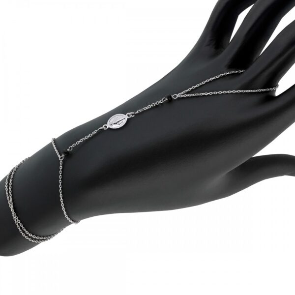 Bransoletka na rękę i palec srebrna z medalikiem i czarnymi koralikami