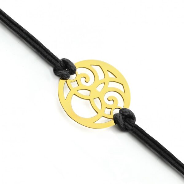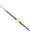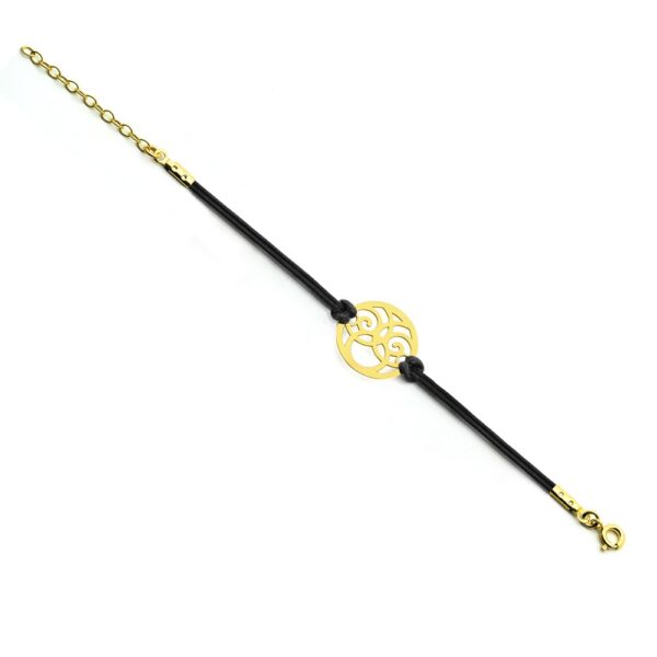 Bransoletka z przywieszką na ozdobnym rzemyku. Przywieszka oraz zapinanie wykonane ze srebra próby 925 oraz pokryte warstwą 24 karatowego złota. Długość bransoletki: 16-20 cm. Wielkość przywieszki: 17×17 mm.