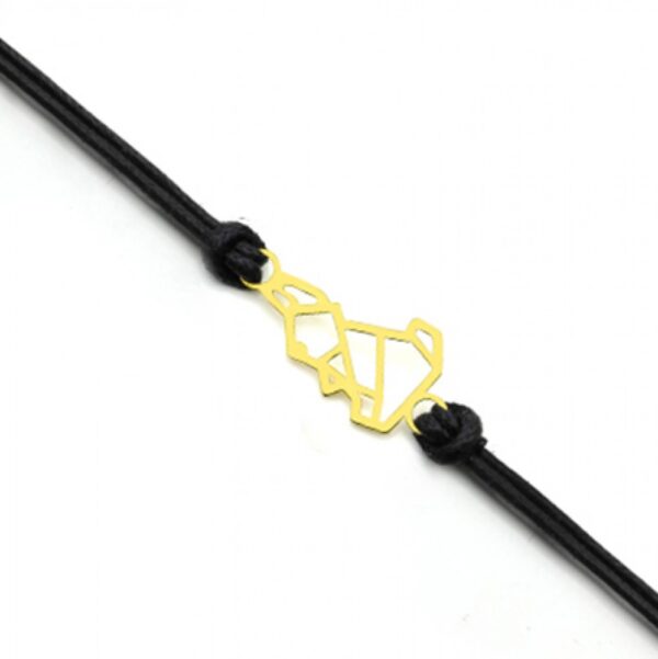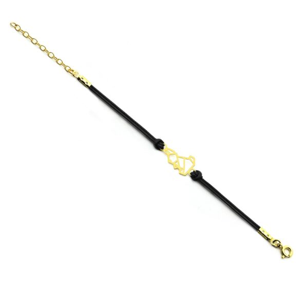 Bransoletka z przywieszką na ozdobnym rzemyku. Przywieszka oraz zapinanie wykonane ze srebra próby 925, dodatkowo pokryte warstwą 18 karatowego złota. Długość bransoletki: 16-20 cm. Wielkość przywieszki ok. 20×10 mm.