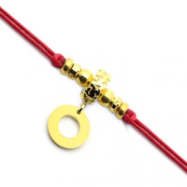 Bransoletka na sznurku czerwonym srebrna pozłacana wisząca blaszka kółko
