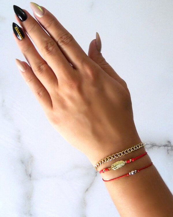 Bransoletka szczęścia wykonana z jedwabnego sznurka.Przywieszka, kulki wykonane ze srebra próby 925, dodatkowo uszlachetniona warstwą 18 karatowego złota. Bransoletka jest regulowana. Wielkość piórka 1,5 cm.