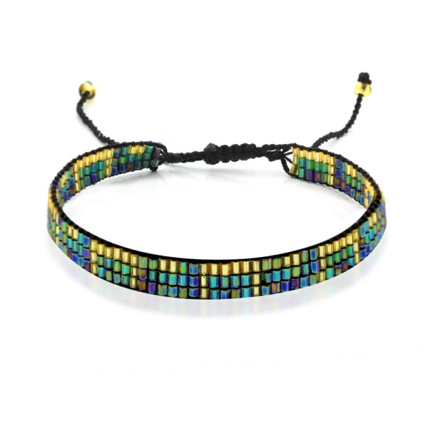 Bransoletka ściągana wykonana z rzemyka. Bransoletka zdobiona kolorowymi koralikami. Maksymalny obwód bransoletki: 22 cm.
