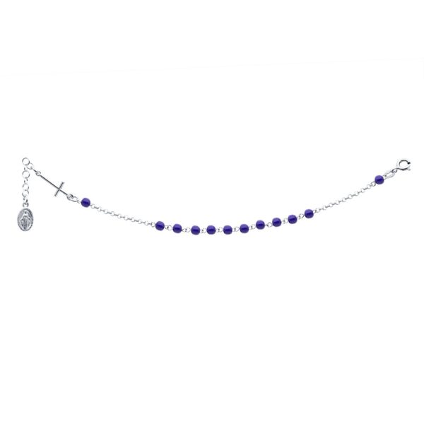 Bransoletka różaniec srebrna niebieskie koraliki. Bransoletka różaniec, wykonana ze srebra próby 925, dodatkowo uszlachetniona rodem. Długość bransoletki: 16-18 cm. Wielkość medalika oraz krzyżyka ok. 10×10 mm. Bransoletka inspirowana domem mody Dolce%Gabbana. Bransoletka idealnie podkreśli Twoją stylizację nadając jej wyjątkowego charakteru. Bransoletka ozdobiona niebieskimi koralikami.