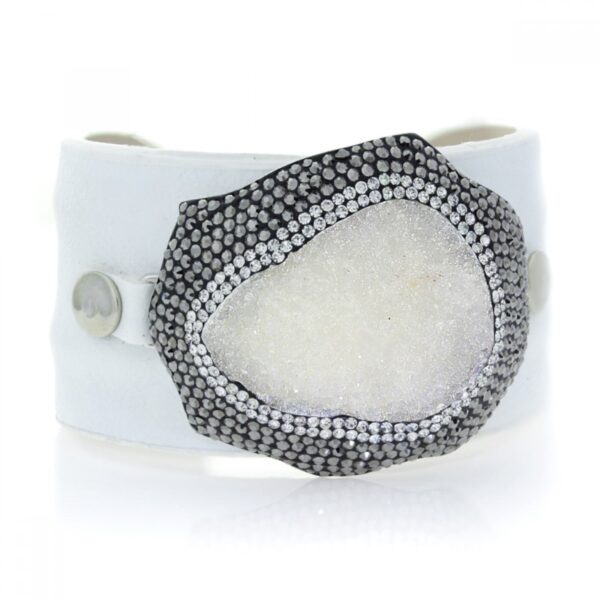 Bransoletka z Kolekcji RockStyle. Srebro rodowane. Biała skóra naturalna. Druzy Stone, Markazyt, Cyrkonia. Próba 925