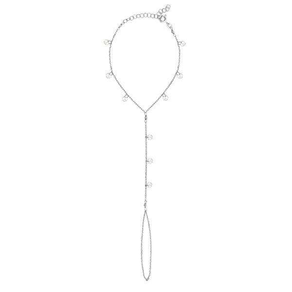 Bransoletka na wierzchnią część dłoni, ozdobiona kryształkami Swarovski.Bransoletka wykonana ze srebra 925 oraz pokryta warstwą rodu. Długość bransoletki wokół nadgarstka: 16-20 cm. Długość od nadgarstka do palca: 7.5 cm. Bransoletka na palec to delikatny łańcuszek opleciony wokół nadgarstka i środkowego palca. Idealny dla osób, którym znudziły się tradycyjne dodatki i w dziedzinie biżuterii poszukują nowych wrażeń.
